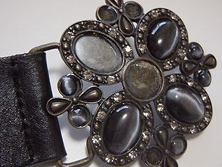 お客様から、あるベルトをお預かりしました。このベルトは大きなバックルが付いていて、複数の石を使ったデザインになっています。お預かりした状態では数箇所、石が取れてしまった状態となっていました。石はキャッツアイです。